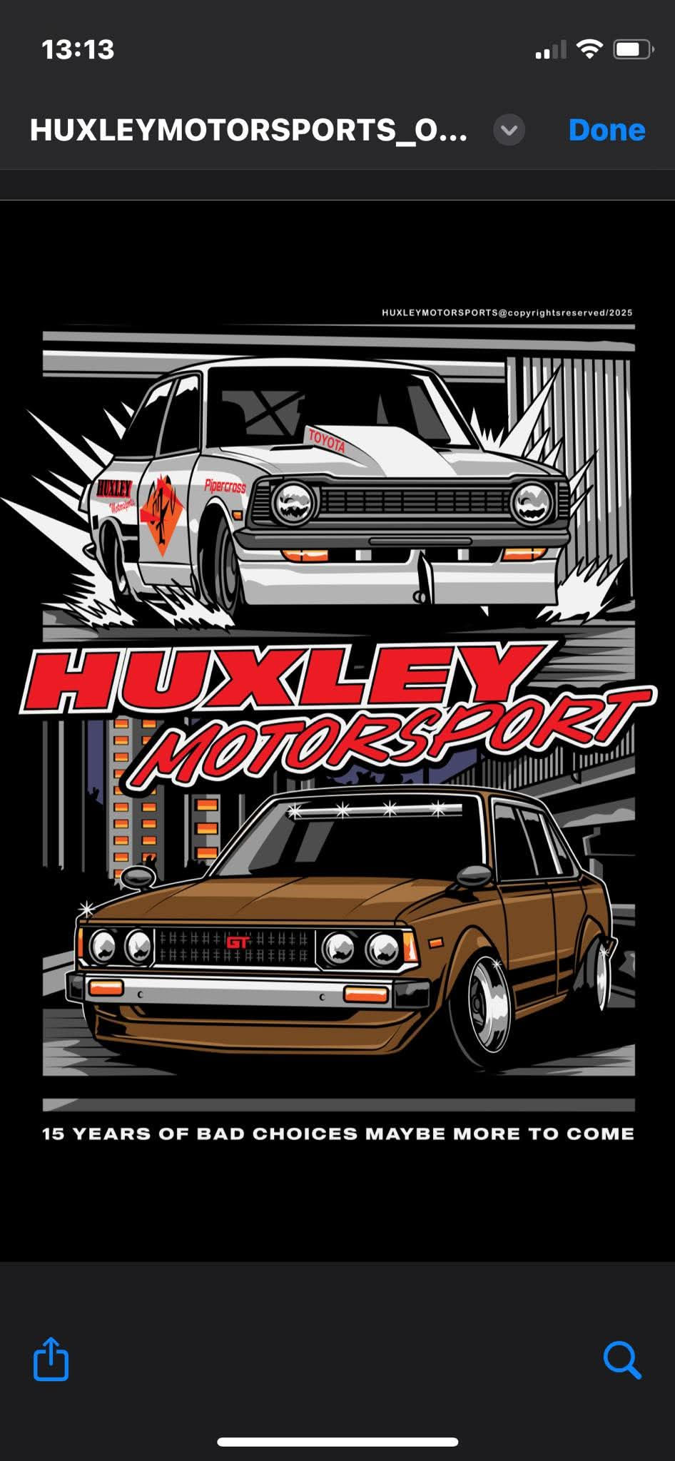 Vintage Huxley Motorsport logo to the front with large illustration to the rear.